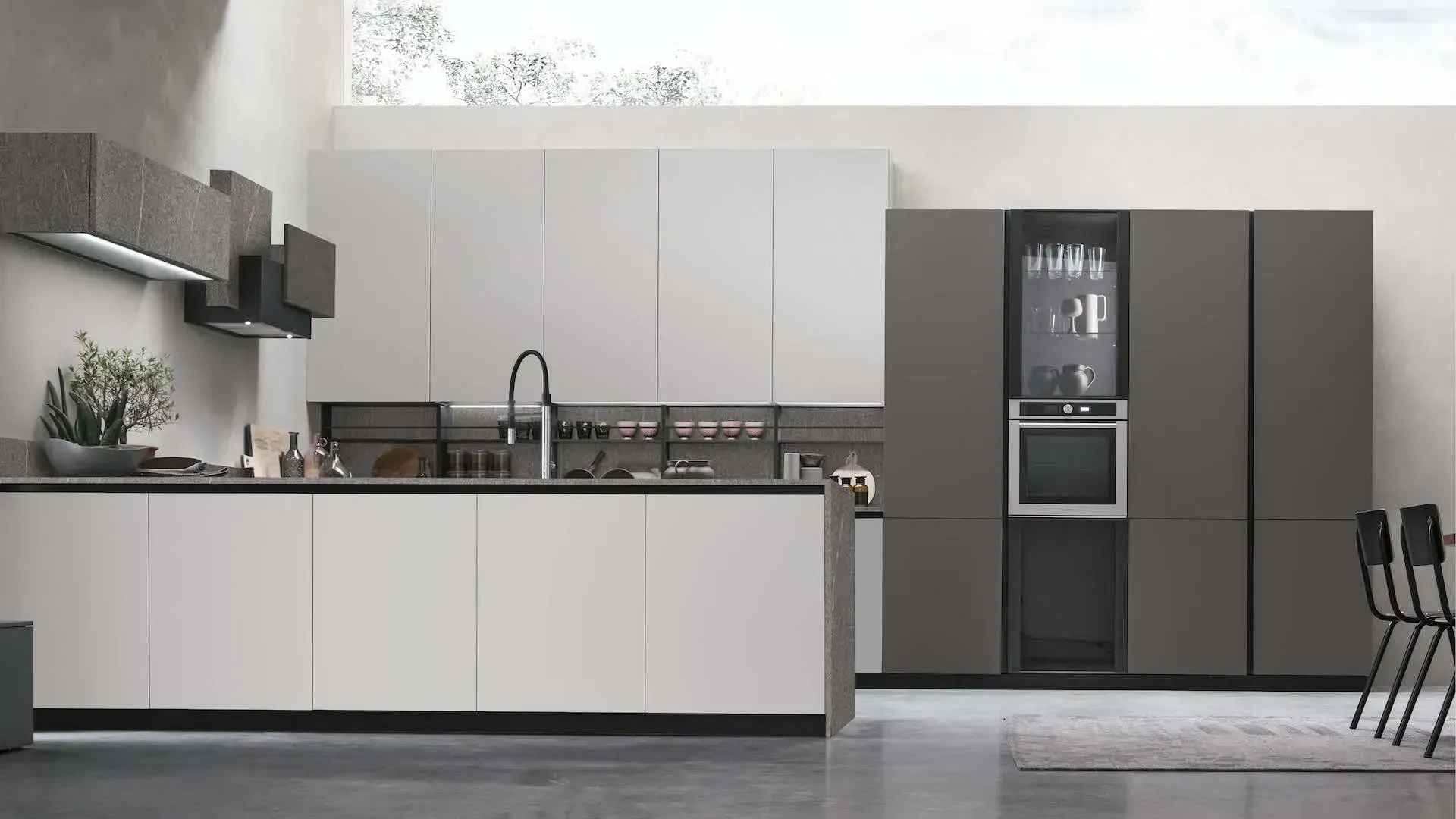 Basi e pensili in Pet Nebbia opaco. Colonne in Pet Canna di fucile opaco. Top, schienale e pensile materico Piasentina scura.